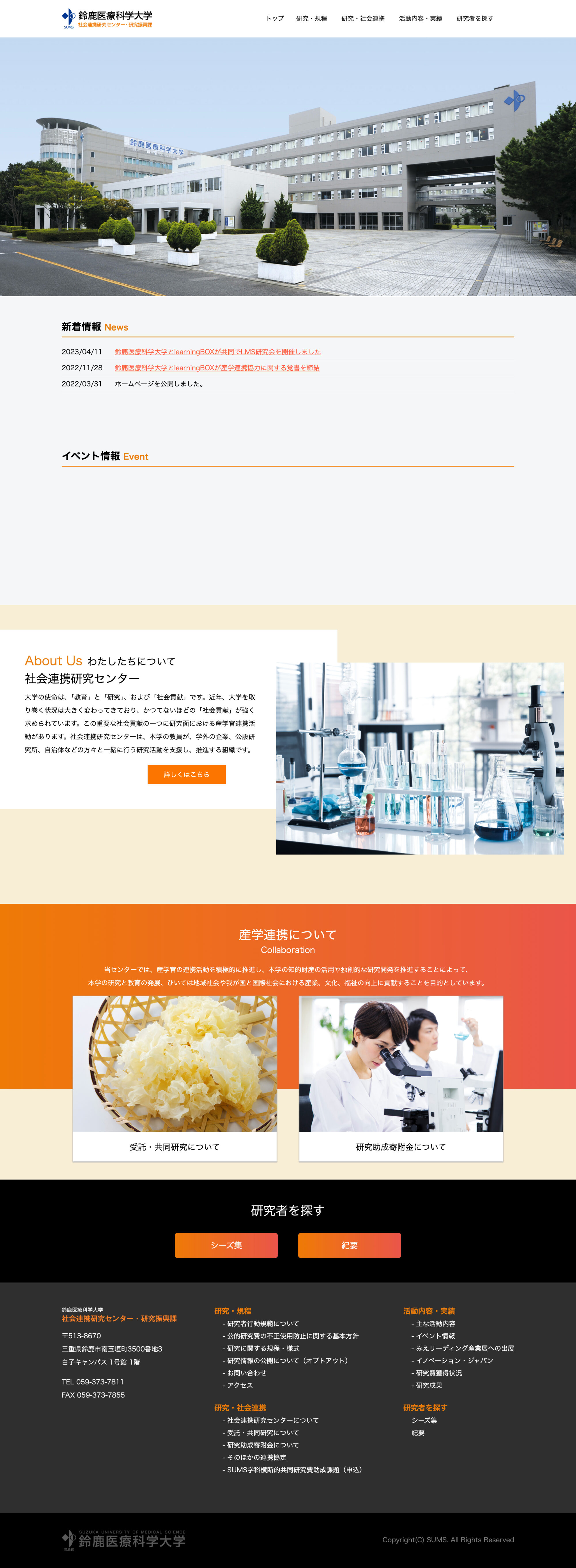 鈴鹿医療科学大学 Client鈴鹿医療科学大学 Year2022 URL鈴鹿医療科学大学 社会連携研究センター・研究振興課 Role 企画・提案 ディレクション デザイン コーディング CMS 写真撮影 Category WEB SAMPLE